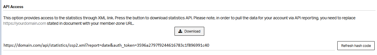 At the bottom of the settings page, you’ll find the API Access section. This section provides an XML link for reporting purposes. The API documentation is available via the Download button.