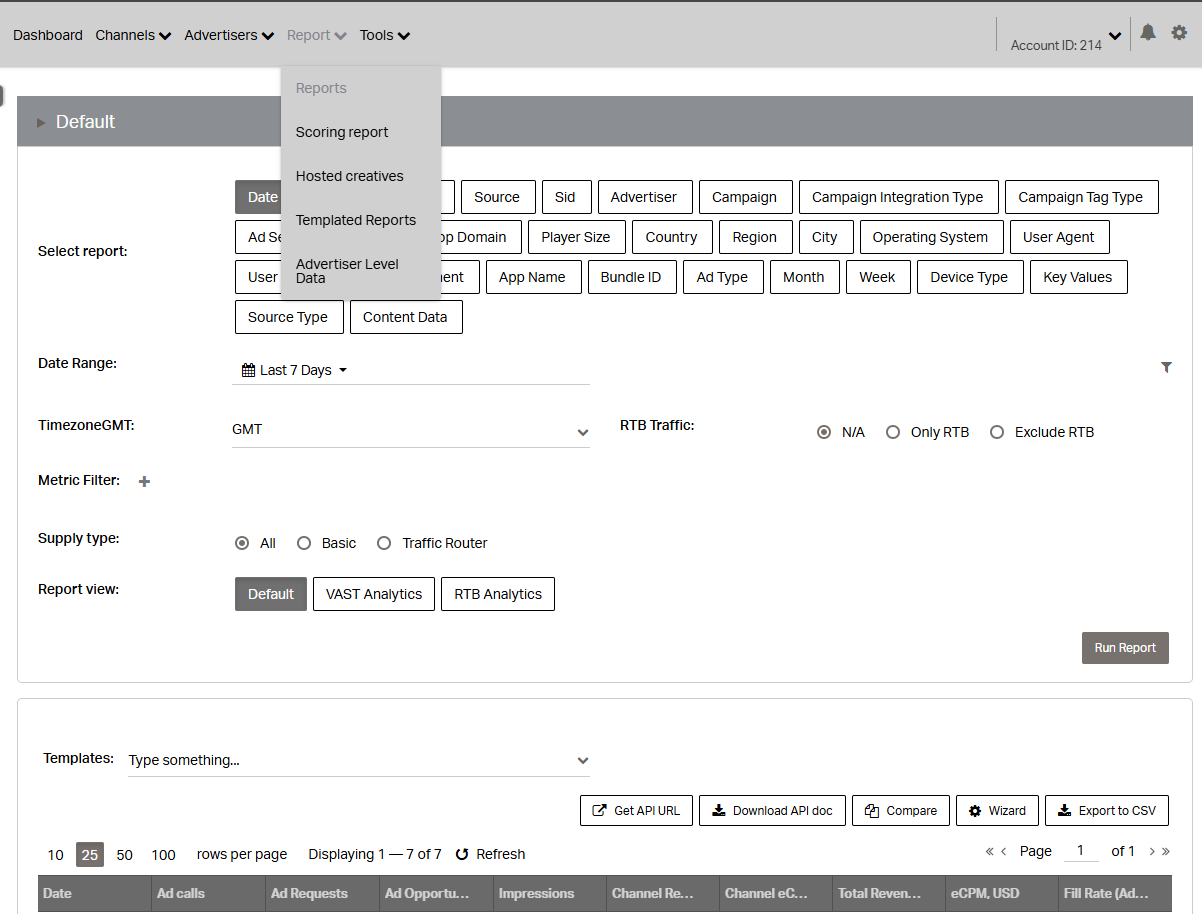 - The Default report shows key performance metrics like Ad Requests, Impressions, Revenue, and Fill Rate.