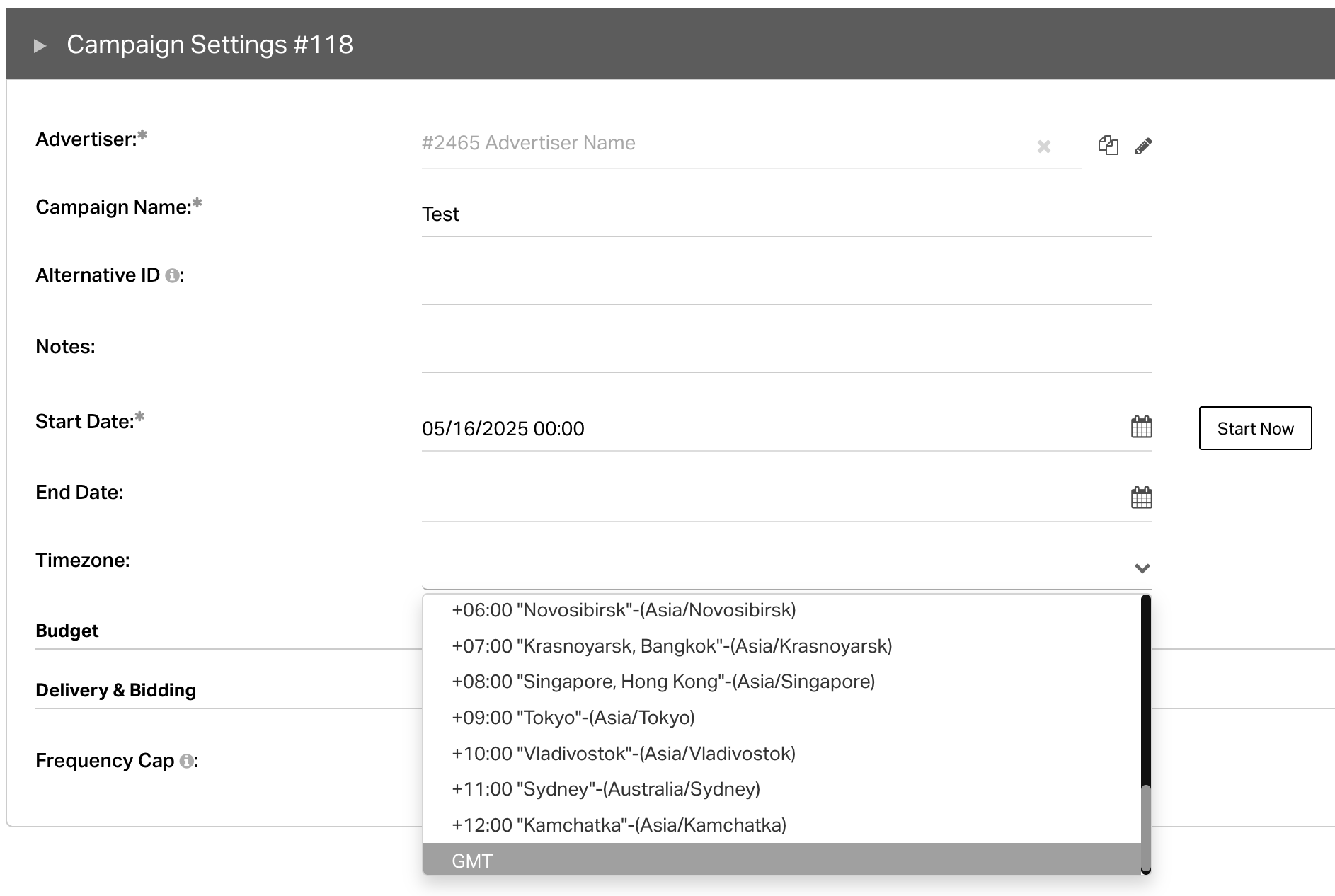 - Setting a specific time zone at the Campaign level will take precedence over the Global time zone. The Line Items under the Campaign will also inherit the time zone set at the Campaign level.