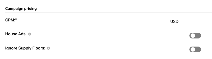 - For non-house campaigns, you can toggle Ignore Supply Floors independently to allow specific deals to serve below the channel floor while still using their configured CPM.