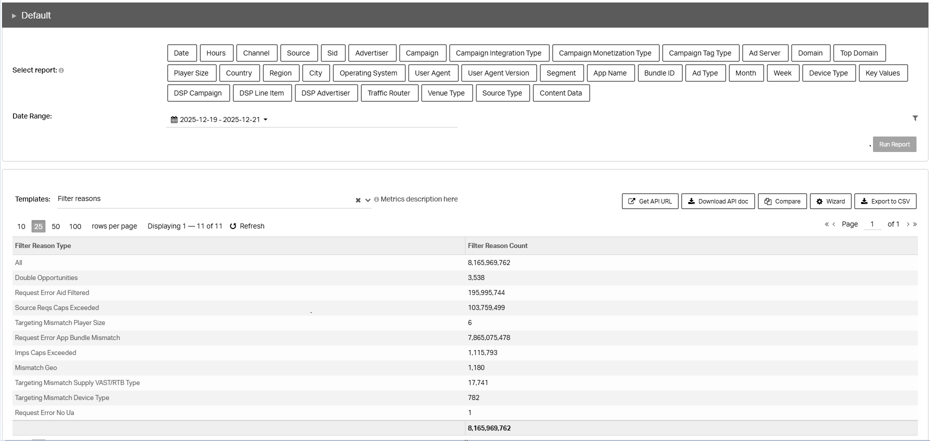 | Campaign | Megatron Mismatch (internal) | Ad calls that were filtered due to internal traffic validation or routing rules |