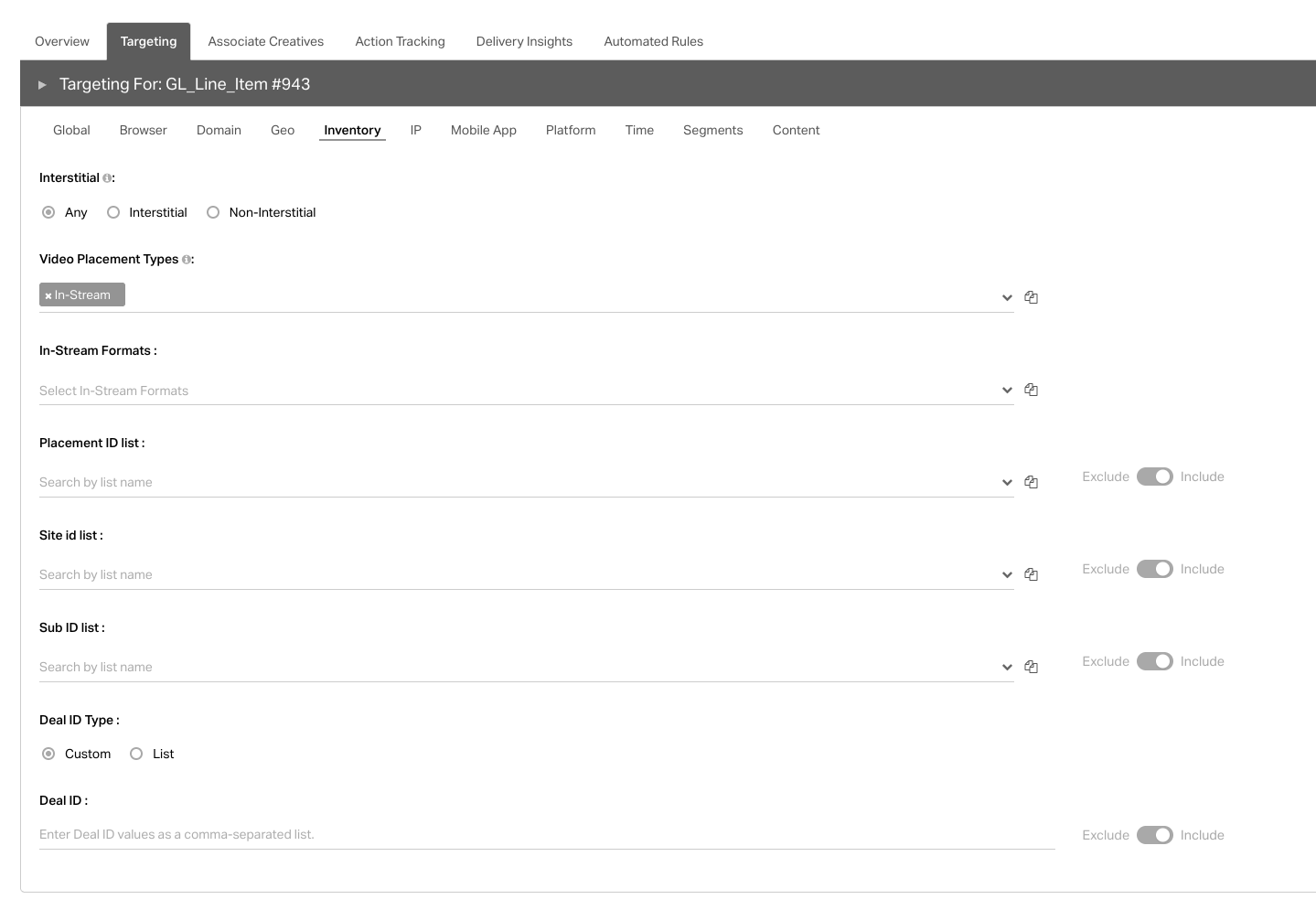 - On the Line Item Targeting → Inventory tab, the Deal ID control now offers a Deal ID Type toggle with Custom (free‑form input) or List (use a saved Deal ID List).