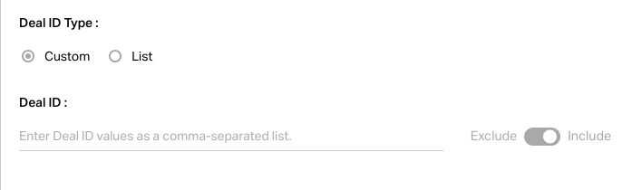 - Choose Include (default) to target only traffic that carries Deal IDs from the selected lists, or switch to Exclude to block those Deal IDs.