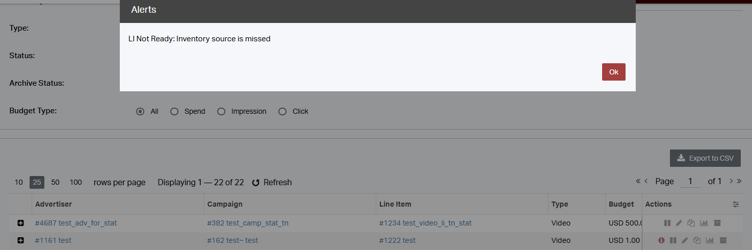 In the "Line Item" tab → Actions, you can find alerts explaining: